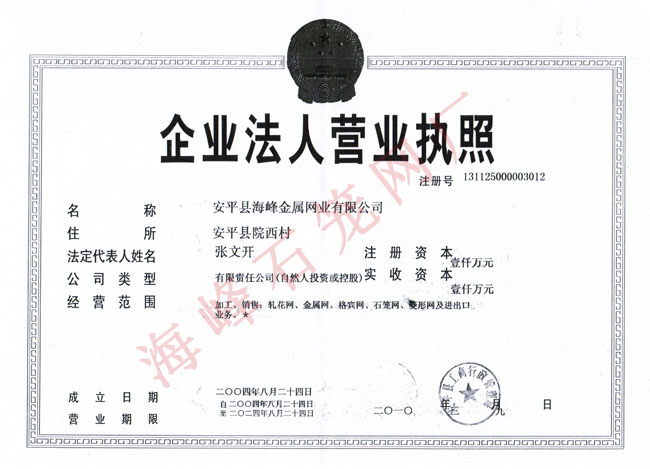 - 安平縣海峰金屬網(wǎng)業(yè)有限公司 安平縣海峰金屬網(wǎng)業(yè)有限公司位于中國(guó)著名的“絲網(wǎng)之鄉(xiāng)”——河北省安平縣,是具有拉絲織網(wǎng)、焊接、剪裁、噴塑、浸塑成品等一整套生產(chǎn)工藝的專業(yè)化廠家。本公司經(jīng)過(guò)多年來(lái)的順勢(shì)發(fā)展,現(xiàn)已擁有廣闊的生產(chǎn)廠房和優(yōu)良的辦公環(huán)境,占地8500平方米,在廠職工100余人。擁有高深的技術(shù)人員,高端的生產(chǎn)設(shè)備,全自動(dòng)的機(jī)械化生產(chǎn)流水線,站在了軋花網(wǎng)、石籠網(wǎng)同行業(yè)的頂端。 查看更多>>